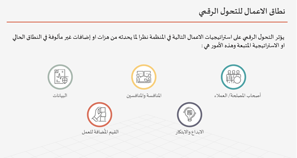 نطاقات أو مجالات الأعمال التي تظهر فيها استخدامات التحول الرقمي و يؤثر عليها بشكل كبير و هي :