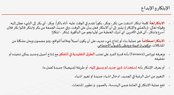 عرف الدكتور الابتكار لغة بإنه من بّكر و بٍكر و اصطلاحاً على انه عملية بناء أو إنتاج شيء جديد على أن يكون اصيلاً و ذا قيمه و يحل مشكلة ما و يحظى بالقبول الاجتماعي.
