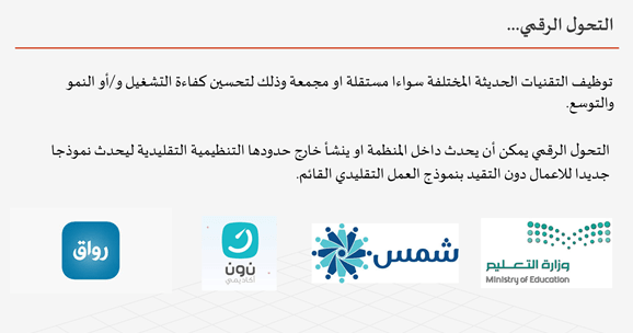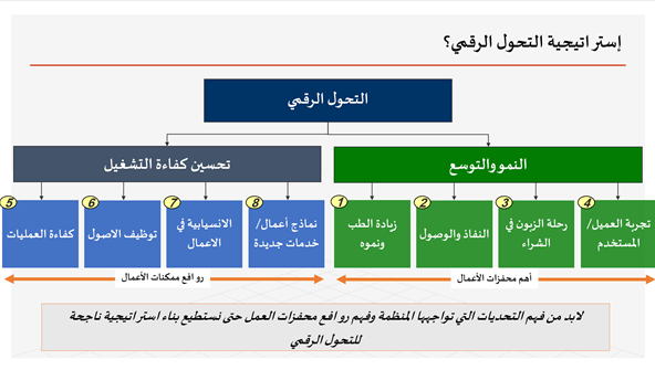 واستعرض استراتيجية التحول الرقمي و التي تتجزء الى النمو و التوسع و تحسين كفاءة التشغيل و منها لابد من فهم التحديات التي تواجهها المنظمة و فهم دوافع ومحفزات العمل بهدف بناء استراتيجية ناجحة للتحول الرقمي.