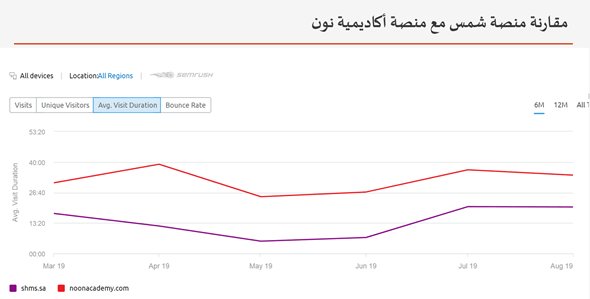 وهنا قارن الدكتور بينهما من جهة عدد الزيارات بينهم حيث تفوقت نون على شمس بعدد 300 ألف زيارة خلال ستة أشهر و امتد هذا التفوق بتناقص حتى شهر أغسطس 2019 , وفي الصورة أعلاه تم مقارنة معدل الوقت الذي يقضيه الوقت الطالب على المنصة حيث أيضا تفوقت نون وهذا المثال يوضح كيفية نموذج التحول الرقمي قد ينشأ خارج الحدود التنظيمية و يتفوق على الجهة الممثلة للتعليم او ما يعرف بـ Business Owner لقطاع التعليم في المملكة.