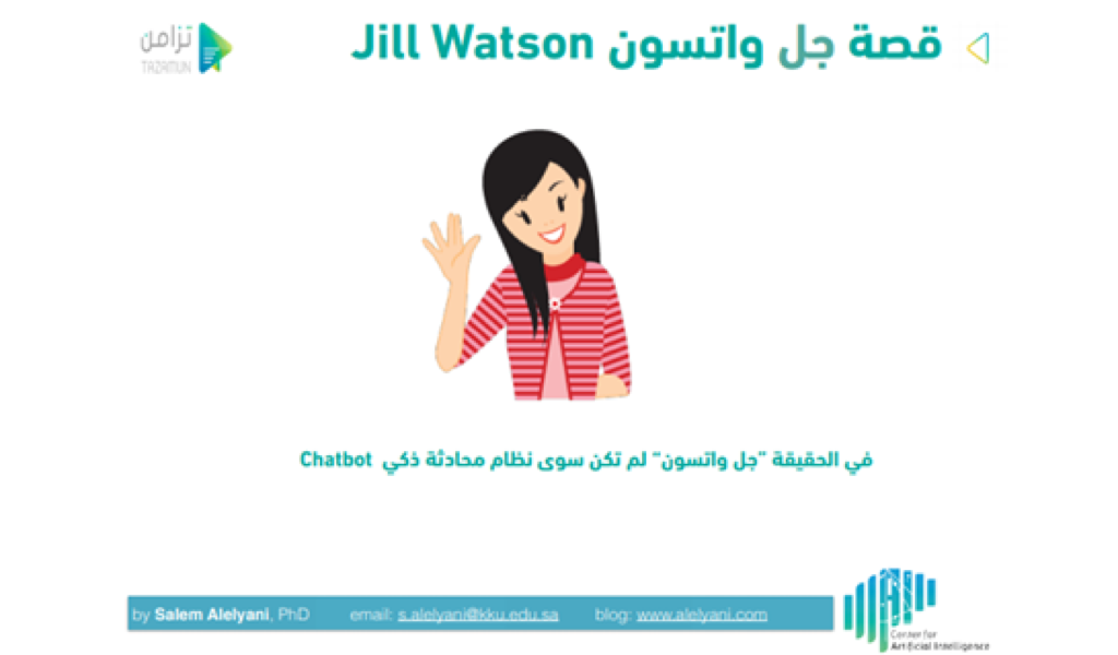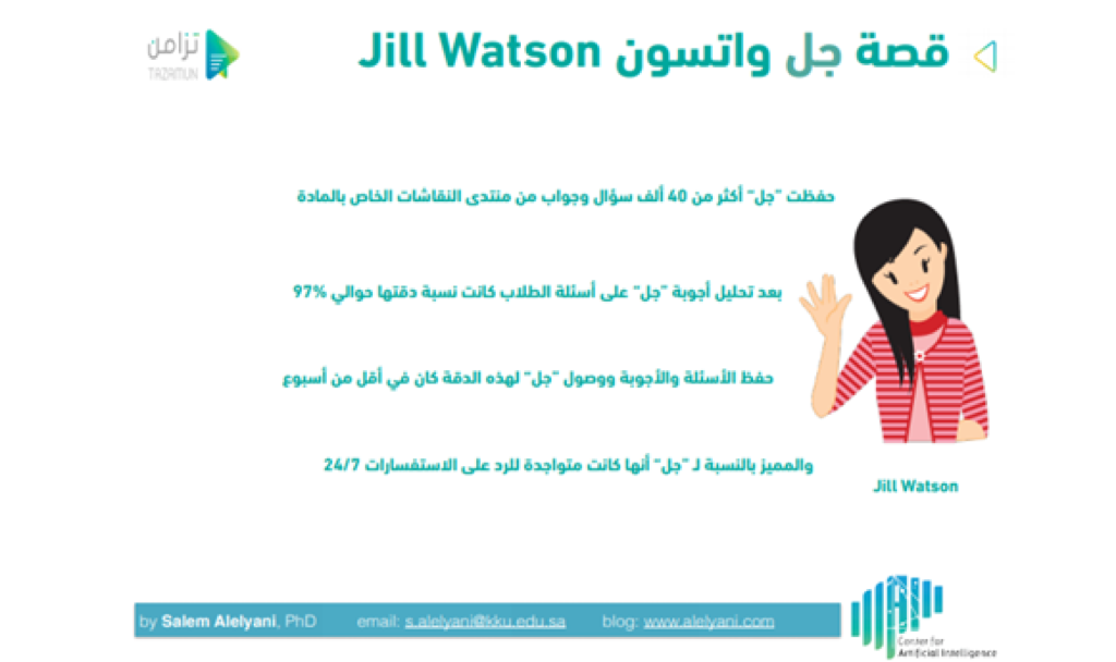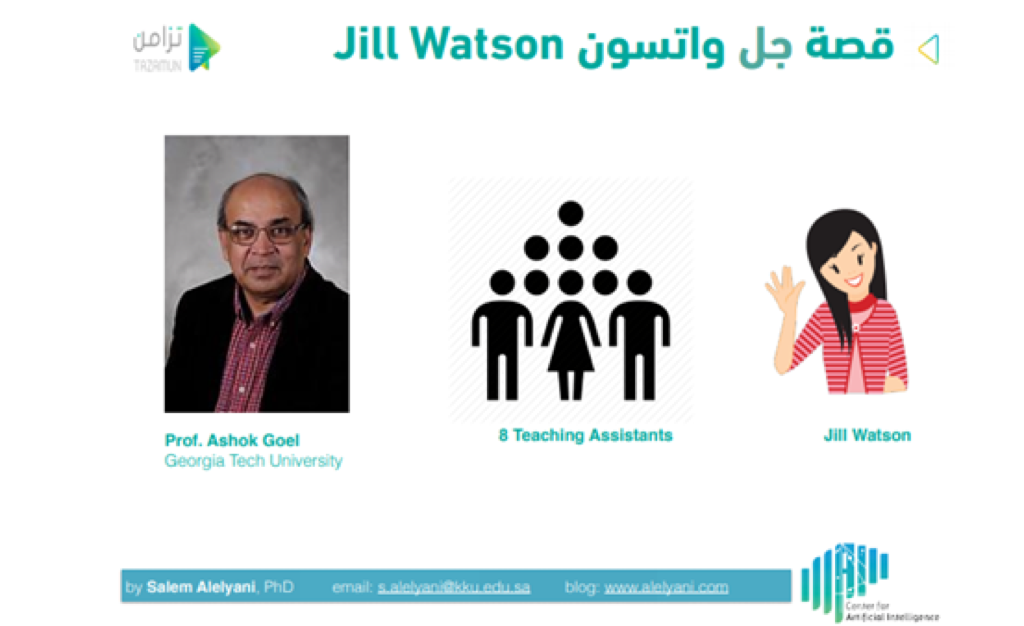 اخيراً استعرض قصة البروفيسور اشوك جول حيث عمل أستاذ في جامعة جورجيا للتقنية في الولايات المتحدة الأمريكية و يدرس مادة الذكاء الاصطناعي وهذه المادة يدرسها أون لاين لقرابة 400 طالب كل ترم من حول العالم , ولوجود لوحة مناقشة إلكترونية للنقاش في كل ما يحتاجونه من مواعيد تسليم الواجبات الى الأسئلة الخاصة بالاختبارات وما إلى ذلك فكان لدى الدكتور 8 أساتذة مساعدين وخصصوا 80% في وقتهم  للرد على استفسارات الطلاب من حول العالم لذا كان للبروفيسور رؤية أخرى حيث قرر إن يوظف جيل واطسون.