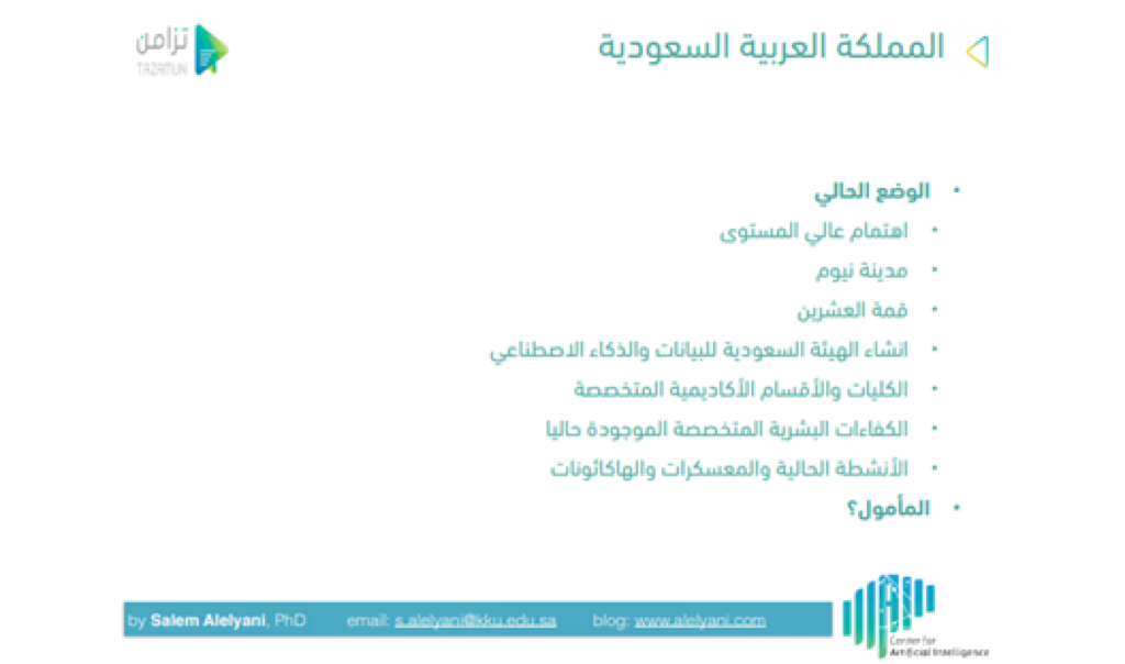 في المملكة اليوم هنالك اهتمام عالي المستوى و مباشر من سمو ولي العهد  بالذكاء الاصطناعي وخصوصا عندما افتتاح تأسيس مدينة نيوم وأنها مدينة للذكاء الاصطناعي وأنها مدينة من المستقبل هذا يوضح الاهتمام بهذا المجال۔