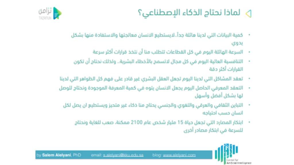 واجاب الدكتور سالم باننا نحتاج المقام الأول الذكاء الاصطناعي بسبب كمية البيانات الهائلة و التي لن يستطيع الإنسان معالجتها أو الاستفادة منها شكل يدوي مثل ذلك الصور التي تلتقطها الطائرات بدون طيار بشكل يومي بهدف المراقبة و أيضا صور الأقمار الصناعية والبيانات التي نضعها على وسائل التواصل الاجتماعي فهذه من أمثلة البيانات التي لا نستطيع معالجتها بشكل سهل اضف الى ذلك الصور الطبية فالدكتور اليوم قد يستغرق وقت طويل جداً في فحص اشعة مريض مصاب بسرطان في حالة مبكرة وقد لا ينتبه لمثل هذه الأعراض لكن الآلة لن تفوت مثل هذه الأعراض الصغيرة ,