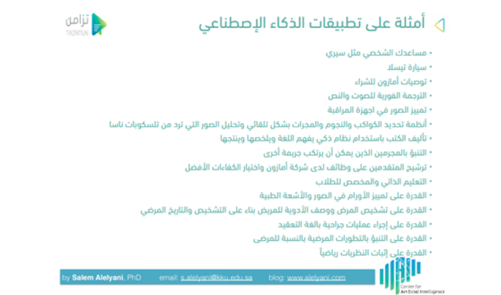 ومن ثم ذكر الدكتور أمثلة لتطبيقات الذكاء الاصطناعي والتي تتمثل في سيري و سيارة تيسلا و توصيات امازون للشراء فمثلاً لو اردت شراء منتج ما من امازون فأنه هذا المنتج يتواجد بالمئات مع تقييمات له لكن تقييمات امازون وفرت عليك جهد البحث و التقييم بحيث تعرض لك الخيارات الأفضل من ضمن المطروحة ، ايضا الترجمة الفورية للنصوص و الصورة , ايضاً تمييز الصورة في أجهزة المراقبة و التي قد تحتوي على مليارات الساعات من المراقبة المصورة ,