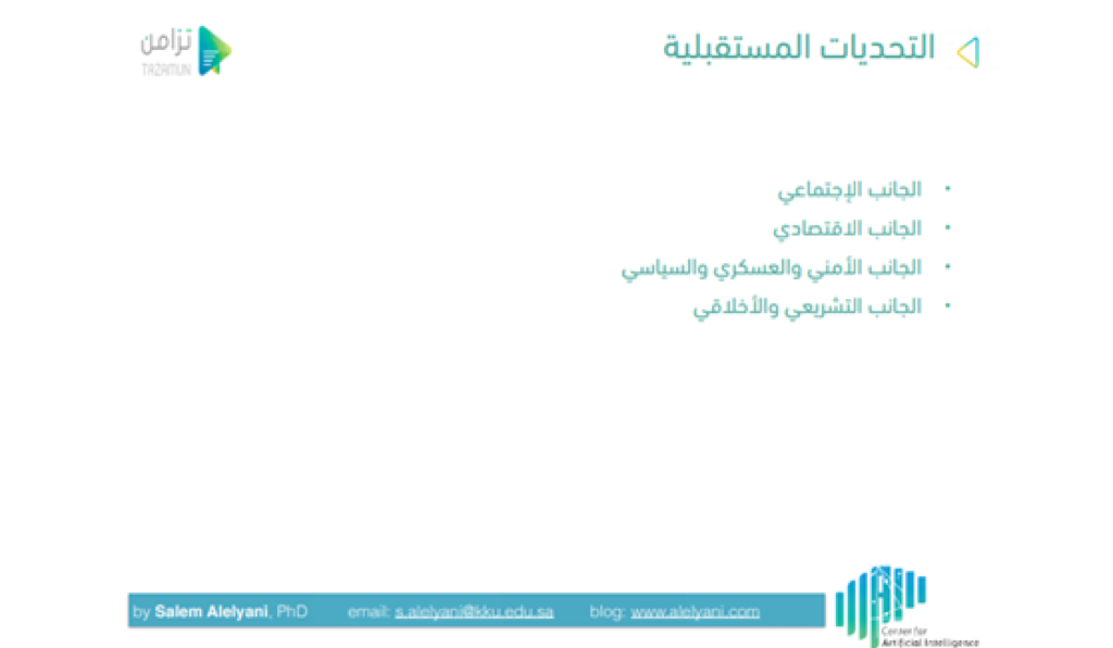 لدينا تحديات المستقبلية كبيرة في الجوانب الاجتماعية فعدد كبير سيخسرون وظائفهم ايضاُ الجانب الاقتصادي  تطور كثيراً مع الذكاء الاصطناعي لذا هنالك فرصة كبيرة للمملكة للتطور حتى على استخدام المدن الذكية التي قد تكون واحدة من الابتكارات الكبيرة بدء من البنية التحتية و مرورا بالطاقة و التعليم و الصحة والنقل و على جميع المستويات  , وهنالك أيضا تحديات امنية و عسكرية وسياسية ليس هنالك مجال لذكرها اخيراً من جوانب التحديات الجانب التشريعي و الأخلاقي فنظراً للتحيز الذي حدث ضد عرق معين في اتخاذ القرارات و القضاء مع العلم ان التحديات تجلب معها الفرص الجديدة.