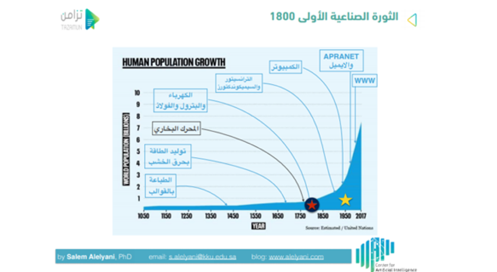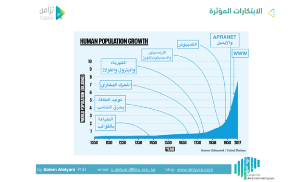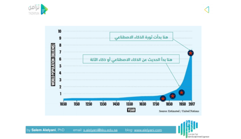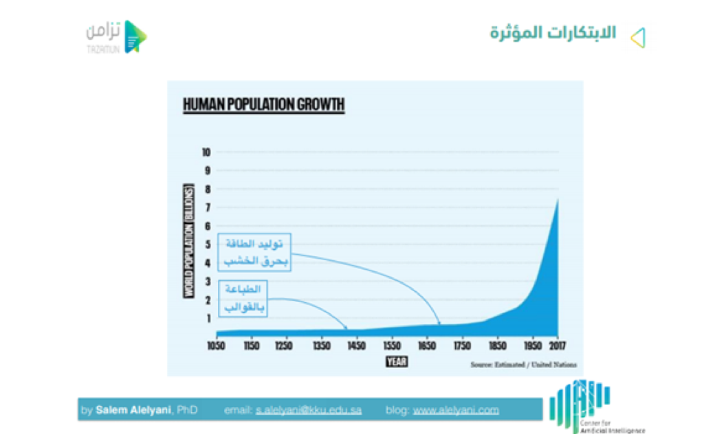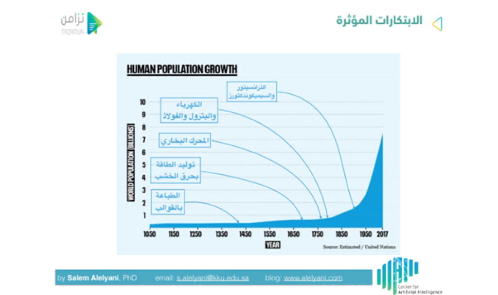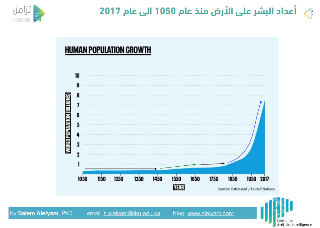بدء الدكتور سالم الندوة بربط  الثورة في الذكاء الاصطناعي و الابتكار  في الذكاء الاصطناعي بالثورات التي حدثت عبر التاريخ و التي أثرت بشكل مباشر  في البشرية وفي الصورة ادناه تجدون احصائيات اعداد البشرية منذ 1000 عام حيث من  الملاحظ ارتفاع أعداد البشرية و عند الاقتصاديون هذا مؤشر للانتعاش اقتصادي حيث أن أعداد البشرية ما بين عامي 1050 م –  1450م لم تتجاوز 200 مليون نسمة وذلك خلال 400 سنة , فالمواليد يقابلهم وفيات , لكن في عام 1450 م لاحظ العالم ليونيل بروز  نمو بسيط في أعداد البشرية ، فمن عام 1450 م الى 1650 م تضاعف أعداد البشر من 200 مليون الى قرابة 400 – 500 مليون نسمة ومن ثم تزايد هذا النمو ففي عام 1800 اختفى النمو الخطي الذي استغرق 200 سنة ليظهر نمو متزايد كل 15 –  20 سنة وعرف على أنه طفرة Exponential وقفزت الاحصائيات من مليار شخص الى 7 ونصف مليار نسمة في أقل من 200 سنه .