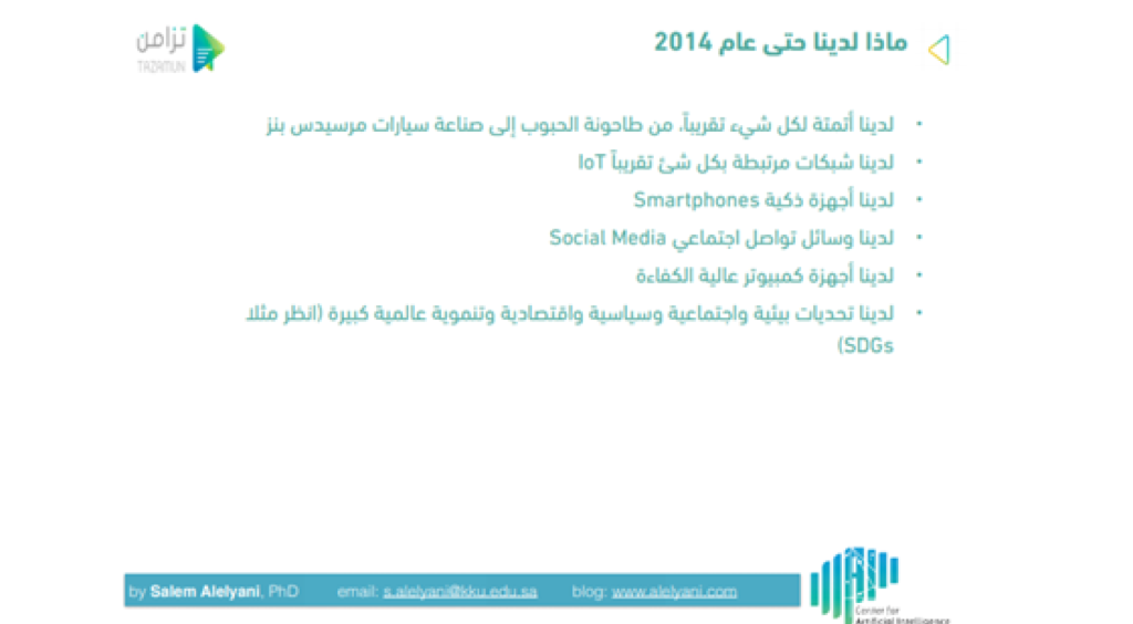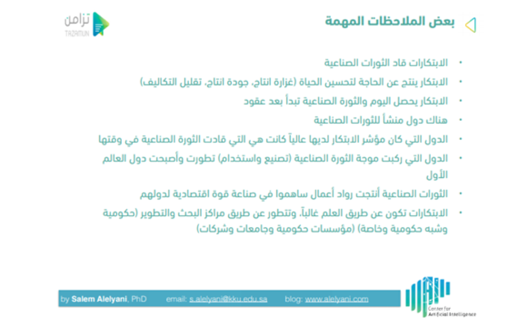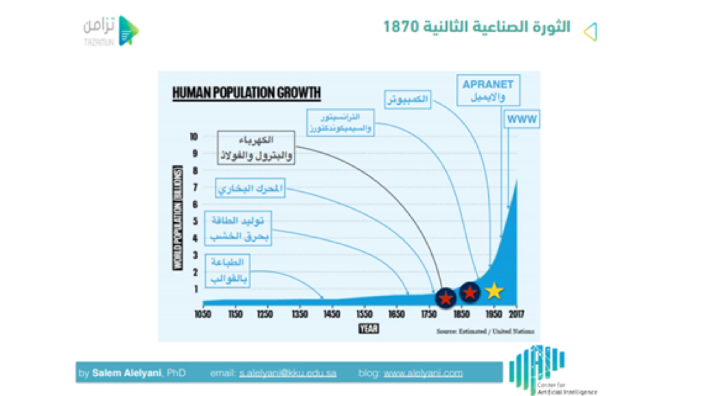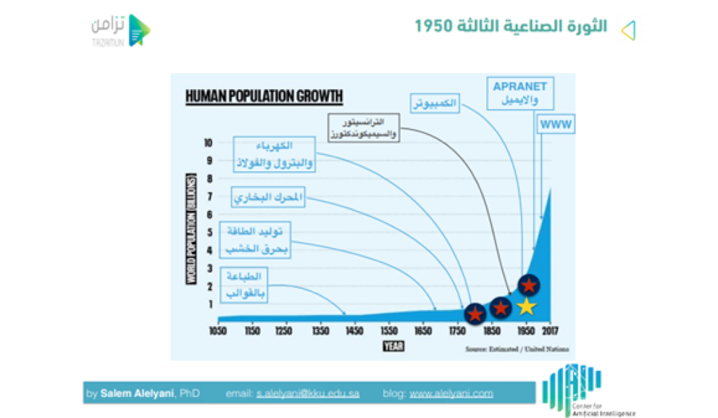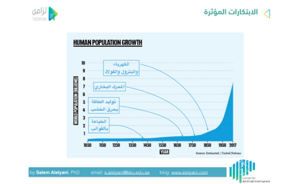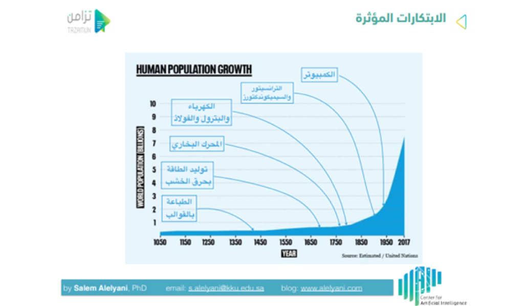 بدء الدكتور سالم الندوة بربط  الثورة في الذكاء الاصطناعي و الابتكار  في الذكاء الاصطناعي بالثورات التي حدثت عبر التاريخ و التي أثرت بشكل مباشر  في البشرية وفي الصورة ادناه تجدون احصائيات اعداد البشرية منذ 1000 عام حيث من  الملاحظ ارتفاع أعداد البشرية و عند الاقتصاديون هذا مؤشر للانتعاش اقتصادي حيث أن أعداد البشرية ما بين عامي 1050 م –  1450م لم تتجاوز 200 مليون نسمة وذلك خلال 400 سنة , فالمواليد يقابلهم وفيات , لكن في عام 1450 م لاحظ العالم ليونيل بروز  نمو بسيط في أعداد البشرية ، فمن عام 1450 م الى 1650 م تضاعف أعداد البشر من 200 مليون الى قرابة 400 – 500 مليون نسمة ومن ثم تزايد هذا النمو ففي عام 1800 اختفى النمو الخطي الذي استغرق 200 سنة ليظهر نمو متزايد كل 15 –  20 سنة وعرف على أنه طفرة Exponential وقفزت الاحصائيات من مليار شخص الى 7 ونصف مليار نسمة في أقل من 200 سنه .