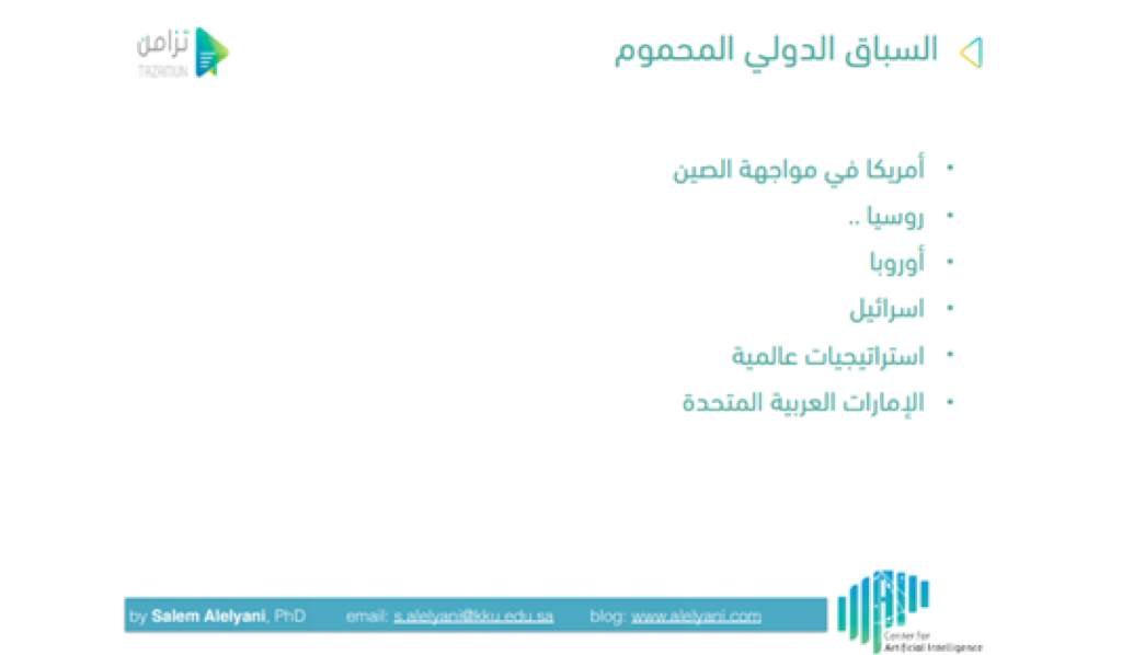 اليوم نلاحظ وجود سباق دولي محمود تجاه الذكاء الاصطناعي و تبني تقنياته و هنالك مواجهة مباشرة بين أمريكا و الصين و علنية , و كما قال الرئيس الروسي أن من يسيطر على الذكاء الاصطناعي سيسطر على العالم مستقبلاً ,في أوروبا بعض العلماء قدموا مقترح أن يكون هناك مركز أبحاث مخصص للذكاء الصناعي في أوروبا , بينما إسرائيل متقدمة جداً في أبحاث كثيره منها الذكاء الاصطناعي و خاصة في مجال الزراعة.