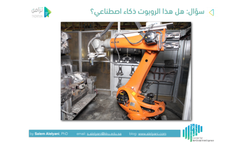 ثم طرح الدكتور سالم سؤال آخر تبادر الى ذهن الجميع هل الروبوت الألي يعتبر ذكاء اصطناعي؟