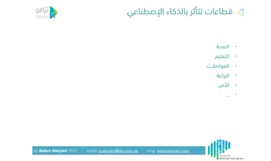 و هنالك قطاعات كثيرة ستتأثر بالذكاء الاصطناعي منها الصحة حيث دخلها بشكل كبير ايضاً التعليم سيتأثر و يؤثر بشكل كبير و قدم الدكتور سابقاً ندوة عن التعليم و علاقته بالذكاء الاصطناعي إضافة الى ذلك المجالات الأخرى مثل المواصلات والزراعة والأمن.