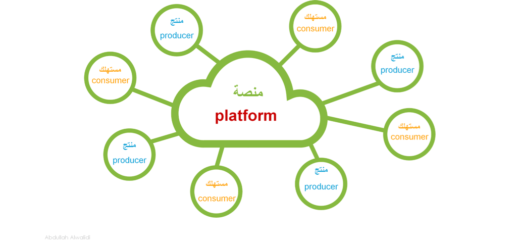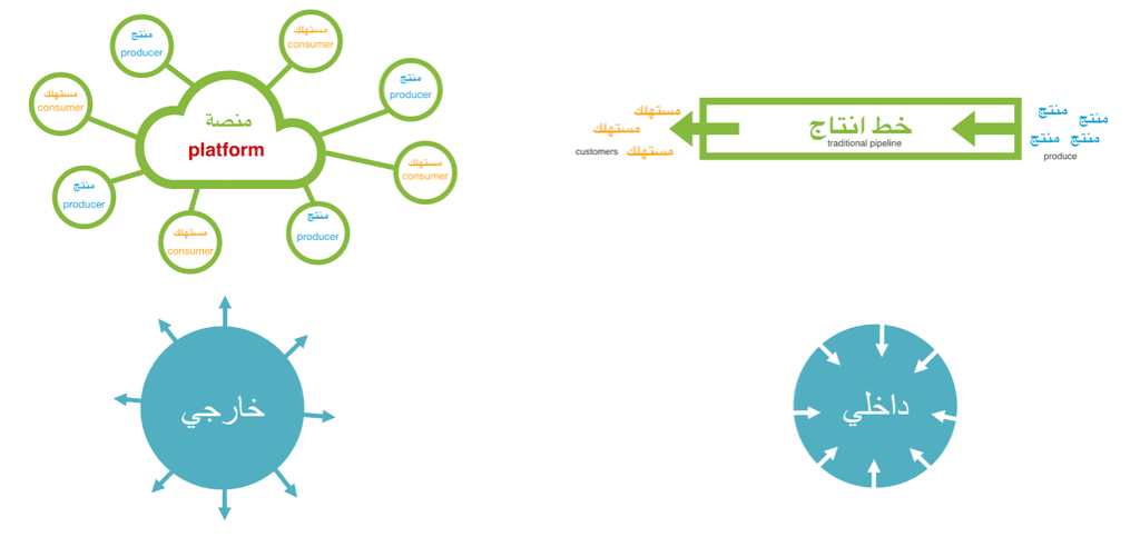 لما نقارن خط الانتاج السابق مع خط الإنتاج في المنصات نجد أن  المنصات بشيئ مختلف تماماً عن الشيء اللي كان معروف سابقاً وتخلت عن فكرة إننا ننتج ونقدمه للمستهلك أننا نكون منتجين ونقدم المنتجات للمستهلكين وأصبحت المنصة عبارة عن وسيط بين المنتج والمستهلك على سبيل المثال YuoTube التي تملكها قوقل، قوقل الآن ما تنتج الفيديوهات في اليوتيوب وإنما هي وسيط بين منتج الفيديو والمشاهد هذا المبدأ البسيط هو الذي عمل ثورة في الأعمال وعمل ثورة في التعليم وسوف يحدث ثورة في مجالات لم يدخلها بعد مثل الصحة وغيرها.