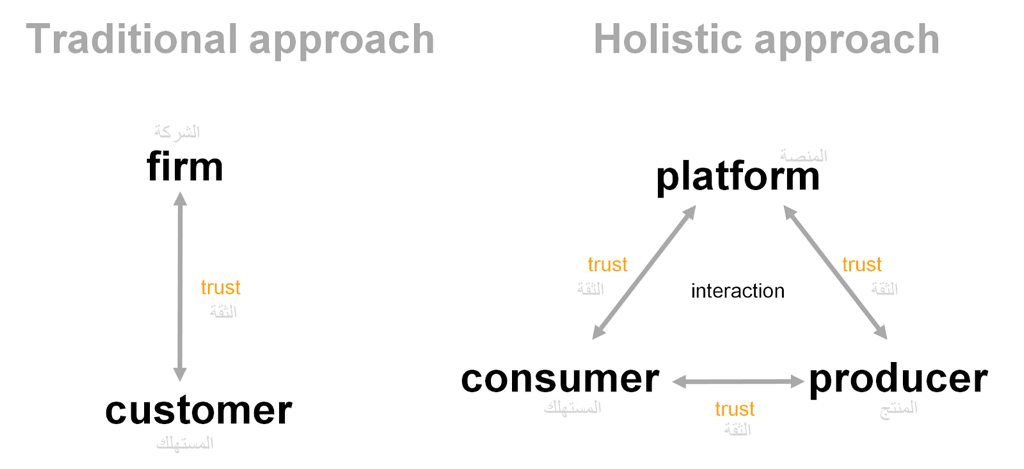 الثقة في الأعمال التجارية التقليدية بين الشركات وعملائها أما في المنصات تحتاج إلى نهج أكثر شمولية حيث الثقة يجب أن تُبني بين المنصة والمشاركين فيها (المنتجين والمستهلكين) وكذلك بين المشاركين أنفسهم (المنتجين والمستهلكين)