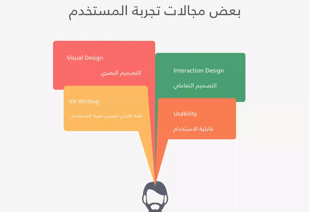 تصميم تجربة المستخدم مجال يشمل مجالات أخرى كثيرة مثل تصميم الواجهات User Interface Design (سواء أكان هذا للويب أو الموبايل أو أي وسط آخر)، تصميم التفاعل Interaction Design وهو مجال يدرس تفاعل الإنسان مع الآلة عموماً واختبارات قابلية الإستخدام Usability Testing لقياس تأثير التصميم ونجاحه وكل ما يرتبط بالبحث أو User Research.