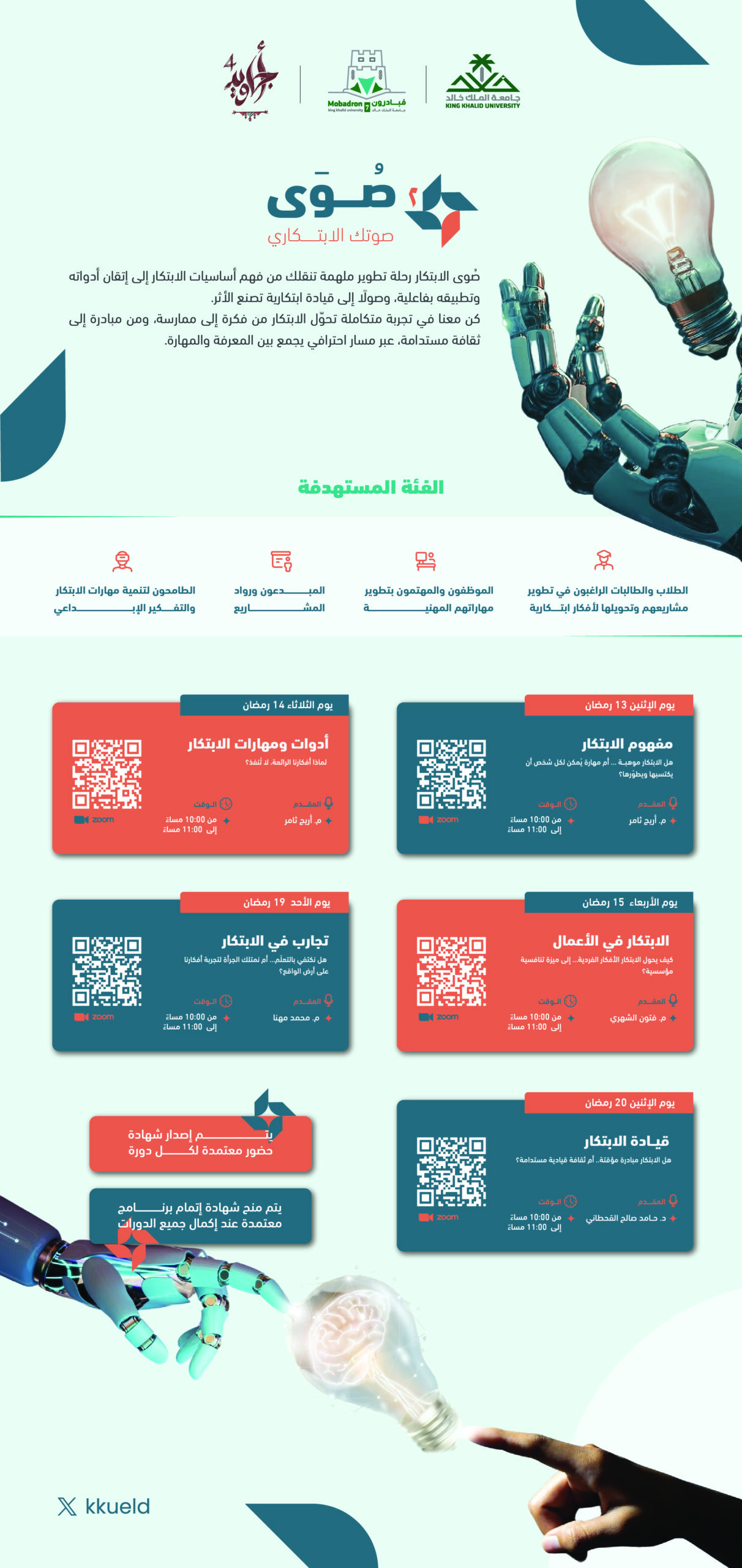 ييقدّم البرنامج رحلة متكاملة تبدأ بأساسيات الابتكار، مرورًا بأدواته العملية، ووصولًا إلى تطبيقاته في بيئات العمل والمشاريع، وانتهاءً ببناء عقلية قيادية قادرة على تحويل الابتكار إلى ممارسة مستدامة. يركز البرنامج على الانتقال من المعرفة إلى التطبيق، من خلال لقاءات تفاعلية تجمع بين المفاهيم، والأدوات، والتجارب الواقعية، بما يساعد المشاركين على تطوير أفكارهم وتحويلها إلى مبادرات ذات أثر. يُقدَّم البرنامج عبر سلسلة لقاءات تدريبية قصيرة ومركزة، تمنح المشاركين فرصة اكتساب مهارات التفكير الإبداعي، وحل المشكلات، وتطبيق الابتكار في سياقات متعددة، مع الحصول على شهادات حضور لكل لقاء، وشهادة إتمام عند استكمال البرنامج..